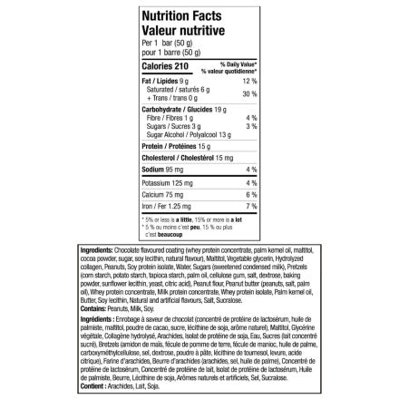 Chocolate Flavored Coating (Whey Protein Concentrate, Palm Kernel Oil, Maltitol, Cocoa Powder, Sugar, Soy Lecithin, Vanilla), Maltitol, Vegetable Glycerin, Hydrolyzed Collagen, Peanuts, Soy Protein Isolate, Water, Sweetened Condensed Milk (Milk Solids Sugar), Pretzels (Corn Starch, Potato Starch, Tapioca Starch, Palm Oil, Carboxymethylcellulose, Dextrose, Salt, Sunflower Lecithin, Baking Soda Powder [Sodium Acid Pyrophosphate, Sodium Bicarbonate, Corn Starch, Mono-calcium Phosphate], Yeast, Citric Acid, Soda), Peanut Flour, Peanut Butter (Peanuts, Salt, Palm Oil) Whey Protein Concentrate, Soy Protein Crisps (Soy Protein Isolate), Milk Protein Concentrate, Whey Protein Isolate, Palm Kernal Oil, Butter (Cream, Salt) Soy Lecithin, Natural and Artificial Favors, Salt, Sucralose.