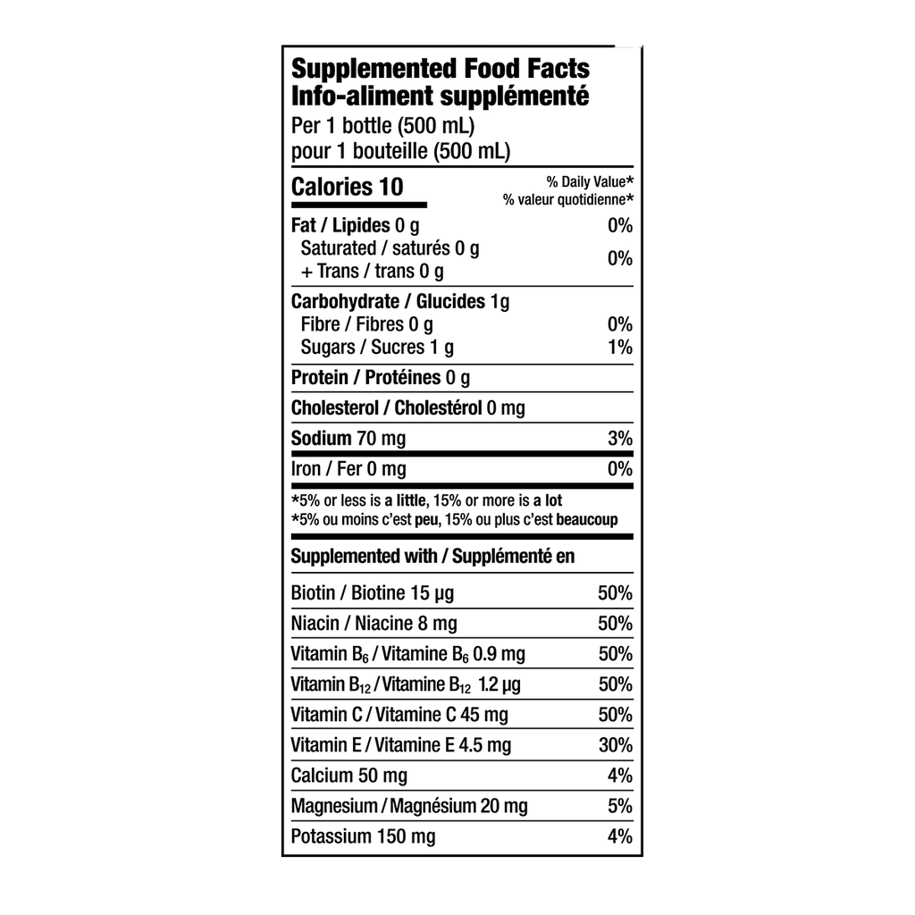 Filtered water, Citric acid, Natural flavour, Cane sugar, Potassium citrate, Calcium lactate, Sweet potato concentrate (colour), Sodium citrate, Magnesium sulfate, Stevia leaf extract, Sea salt, Vitamin C (ascorbic acid), Carrot concentrate (colour), Vitamin E (α-tocopheryl acetate), Vitamin B3 (niacinamide), Vitamin B6 (pyridoxine hydrochloride), Vitamin B7 (biotin), Vitamin B12 (cyanocobalamin)