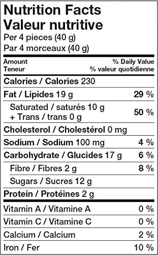 62% Cocoa dark chocolate*FT (cocoa liquor*, cane sugar*, cocoa butter*), Almonds*, Hazelnuts*, Cane sugar*FT, Coconut oil*, Sea salt.
