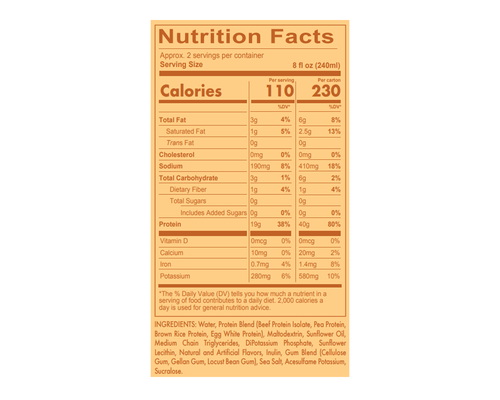 Water, Protein Blend (Beef Protein Isolate, Pea Protein, Brown Rice Protein, Egg White Protein), Maltodextrin, Sunflower Oil, Medium Chain Triglycerides, DiPotassium Phosphate, Sunflower Lecithin, Natural and Artificial Flavors, Inulin, Gum Blend (Cellulose Gum, Gellan Gum, Locust Bean Gum), Sea Salt, Acesulfame Potassium, Sucralose.
