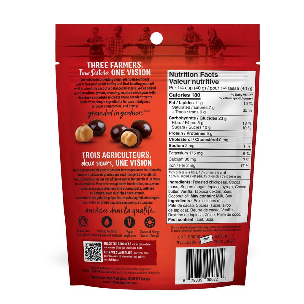 Give in to indulgence that does good by you. Introducing new Dark Chocolate Roasted Chickpeas. Grown on Canadian family farms then small batch-crafted to combine irresistible crunch with the decadent richness of dark chocolate, these crave-worthy chickpeas are an indulgent treat (without the compromise) and always Grounded in Goodness. It’s not cheating—it’s chickpeas!...
